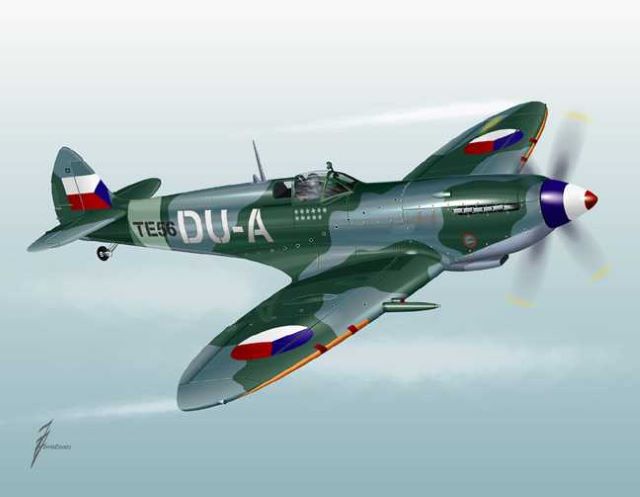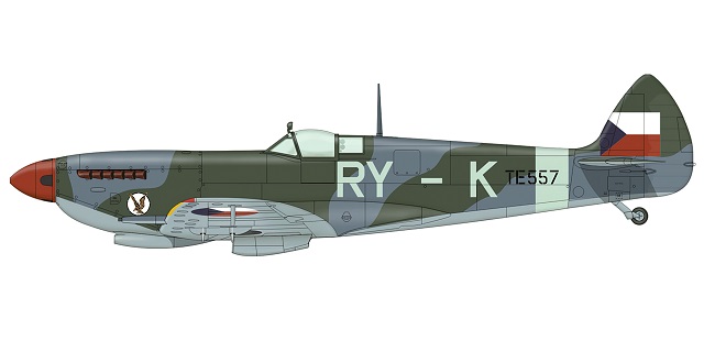 ספיטפייר TE557 בצבעי ח"א הצ'כי. הוטס ארצה ע"י מודי אלון במבצע "ולווטה 1"