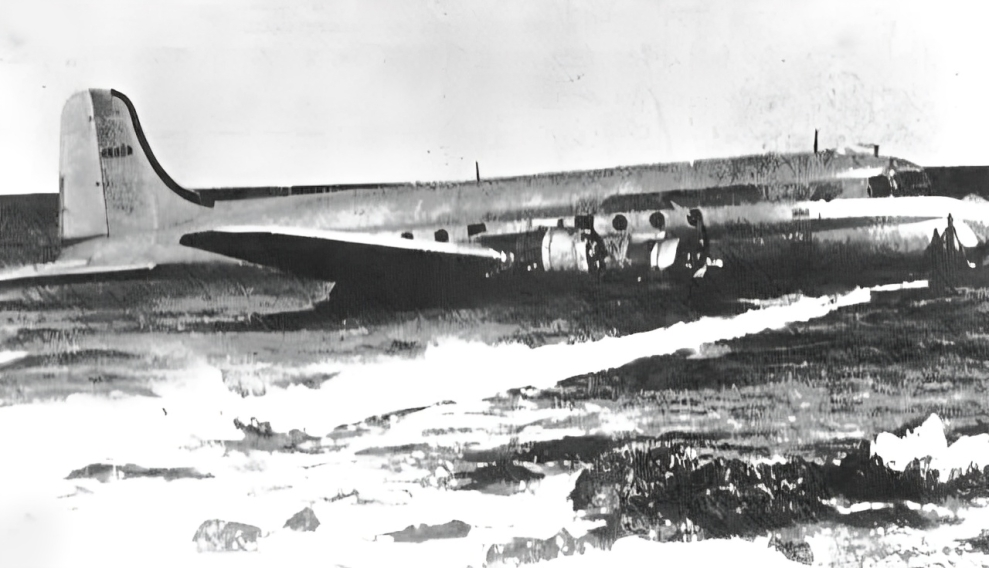 מטוס ה-C-54 מוטל על חוף הים מול שדה דב (מקור: "גשר אוירי לעצמאות")