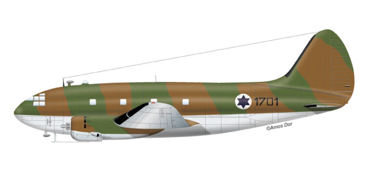 המטוס המוביל: C-46 מס' 1701. בזמן המבצע נשא עדיין את רישומו הפנמי RX-130 (ציור: עמוס דור)
