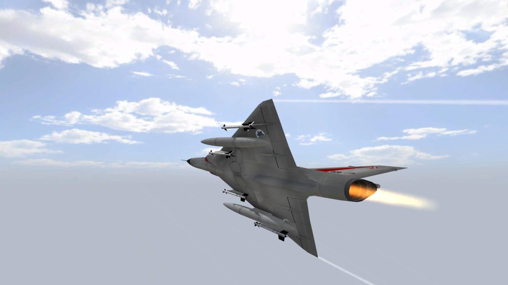 אני מנמיך עוד 2,000 רגל ורץ על פסגת הענן. אך הענן נגמר, ורחוק מאוד מתחתי אני מזהה אך בקושי את העיר תל-אביב, נעה באיטיות אחורנית. 1.72 מאך… 1.78… 1.80. אני מסתכל למטה: נתניה, נראית כמו כתם כחול-אפור על-יד הים… 1.91 מאך… ואני כבר מול קיסריה! מול חיפה אני חייב להפסיק את התרגיל כי אחרת אחרוג מגבולות המדינה.